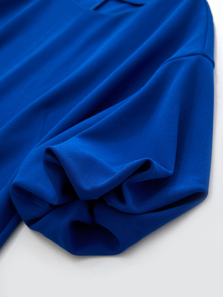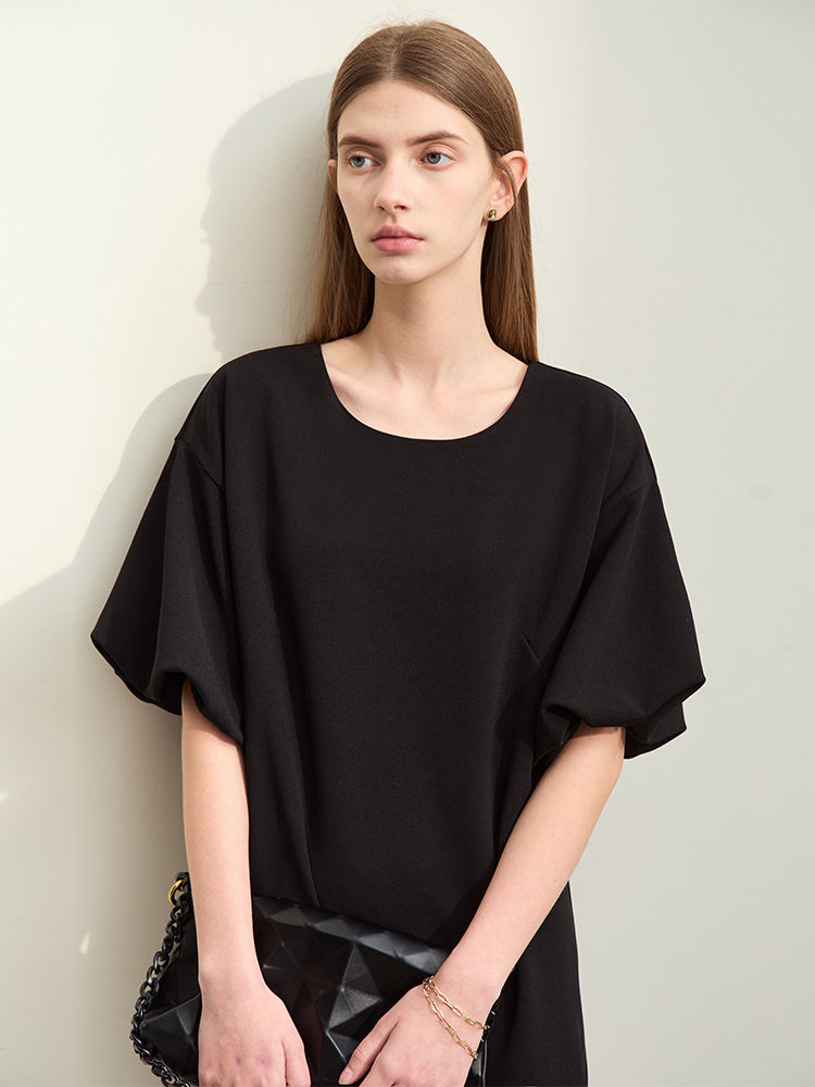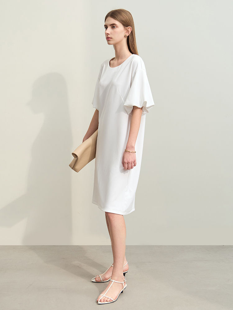 Knee Length Knit Dress, O-Neck, Short Lantern Sleeve, Loose Fit, Solid Polyester