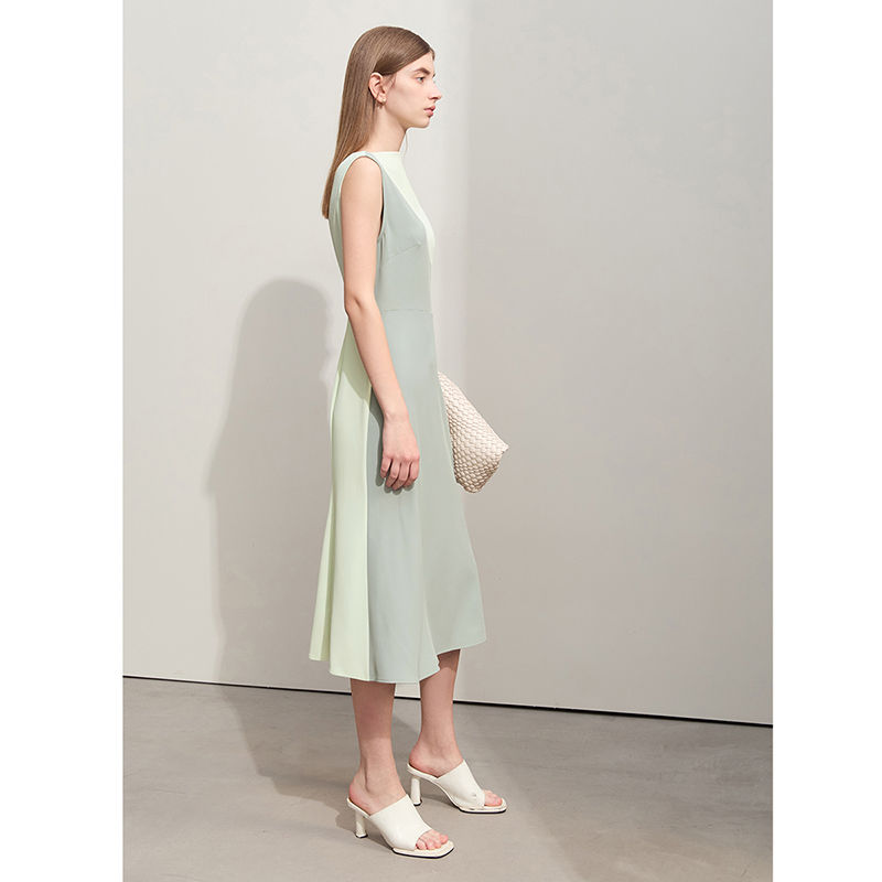 Sleeveless Patchwork Mid-Calf Dress with Zipper Closure, Slim Fit, A-Line Polyes