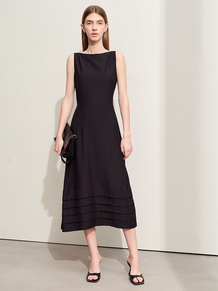 Sleeveless A-Line Mid-Calf Dress with Slash Neck, Zipper, & Solid Pattern - Wool