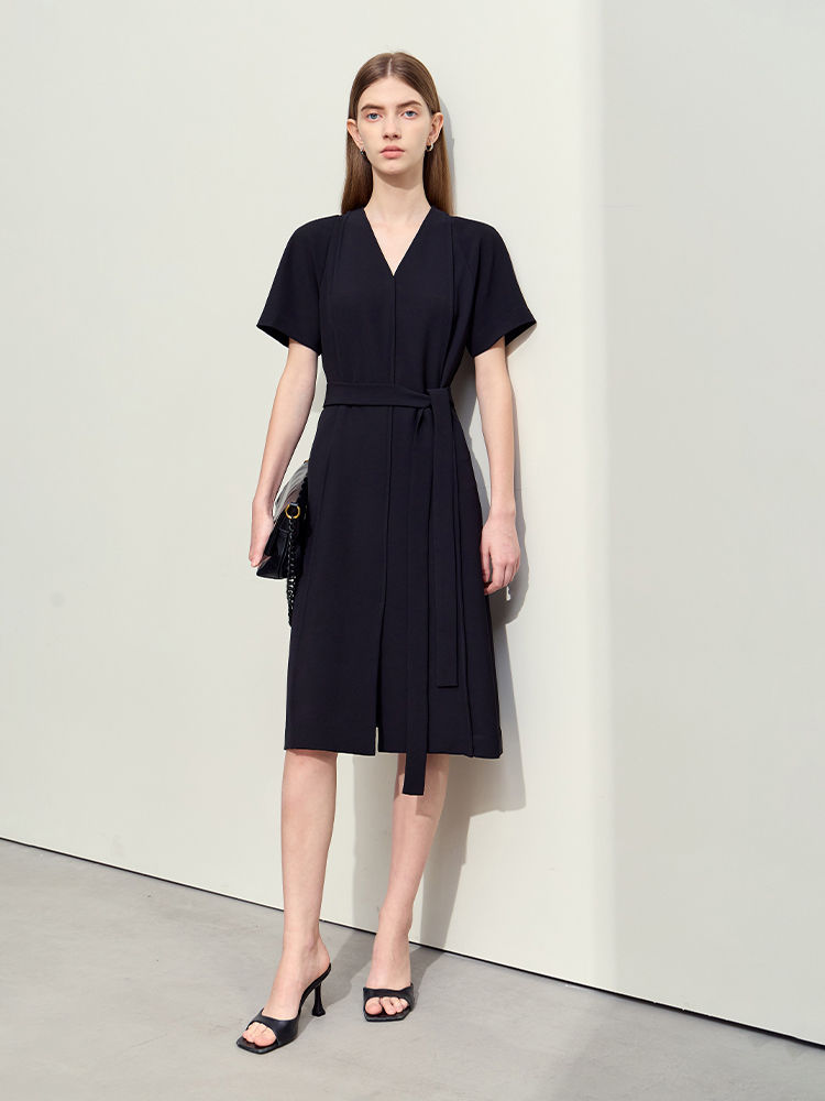 V-Neck Solid Slim A-Line Office Lady Dress with Belt, Knee-Length Polyester Blen
