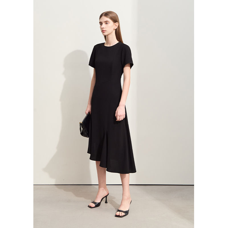 Chiffon Midi Dress Short Sleeve, O-Neck, Solid, Slim Fit, Asymmetrical, Zipper C