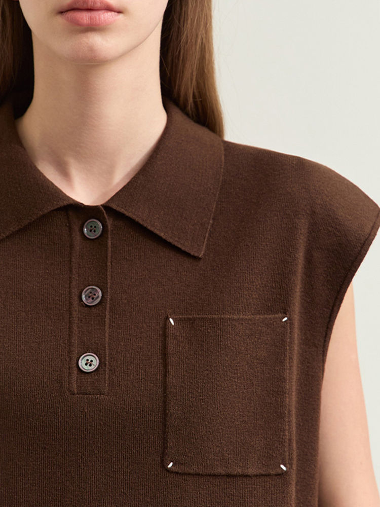 Wool Blend Knitwear Polo Collar Sleeveless Top with Pockets Loose Fit Pullover K
