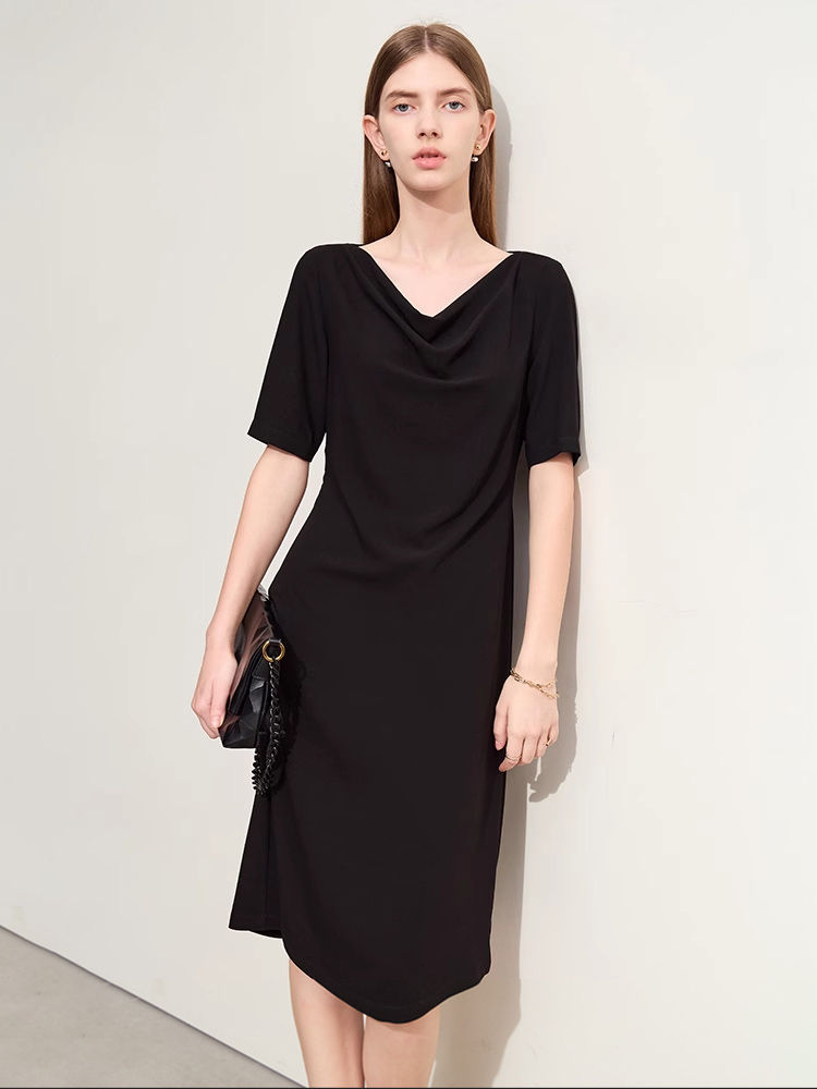 Tags:A-line midi dress for work, swing collar office dress, summer chiffon dress for women, knee length black work dress, half sleeve professional dress, elegant party dress for women, flowy A-line dress for summer, slimming midi dress for women, comfortable office lady dress, draped detail midi dress, solid color summer dress, women's fashion midi dress, new arrival office dress, summer 2025 women's dress trends.