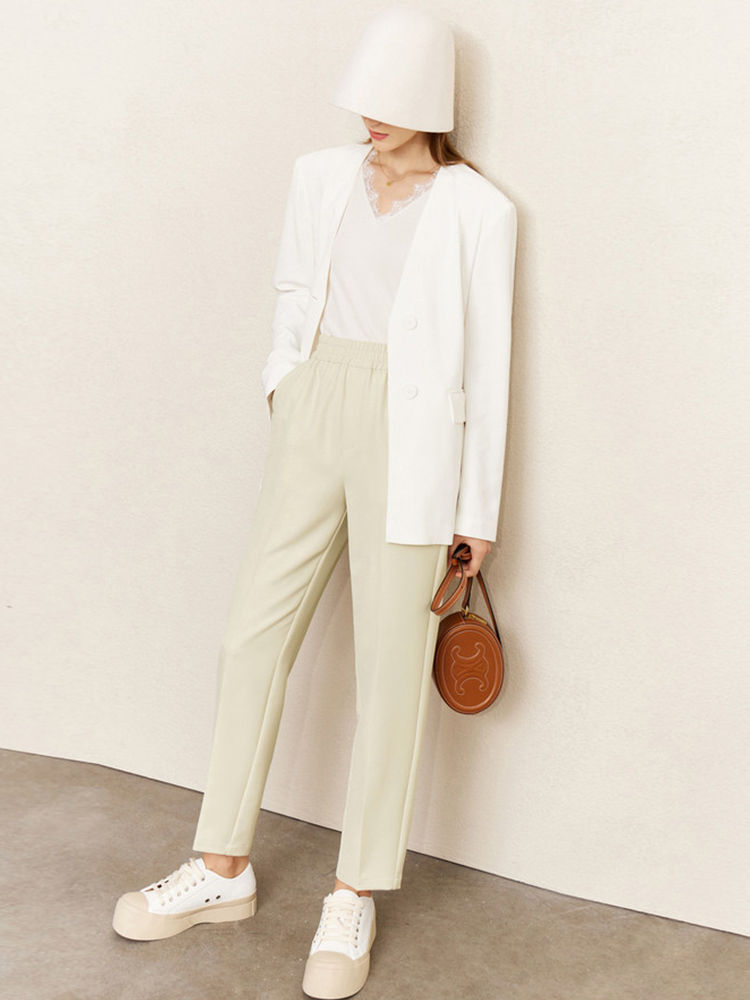 Office Lady Pant Suit: Knitted Blazer & Ankle-Length Wide Leg Pants, Solid, Butt