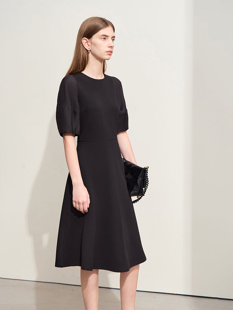 Knee Length Patchwork Dress Round Neck Lantern Sleeve Slim Fit Polyester Dress