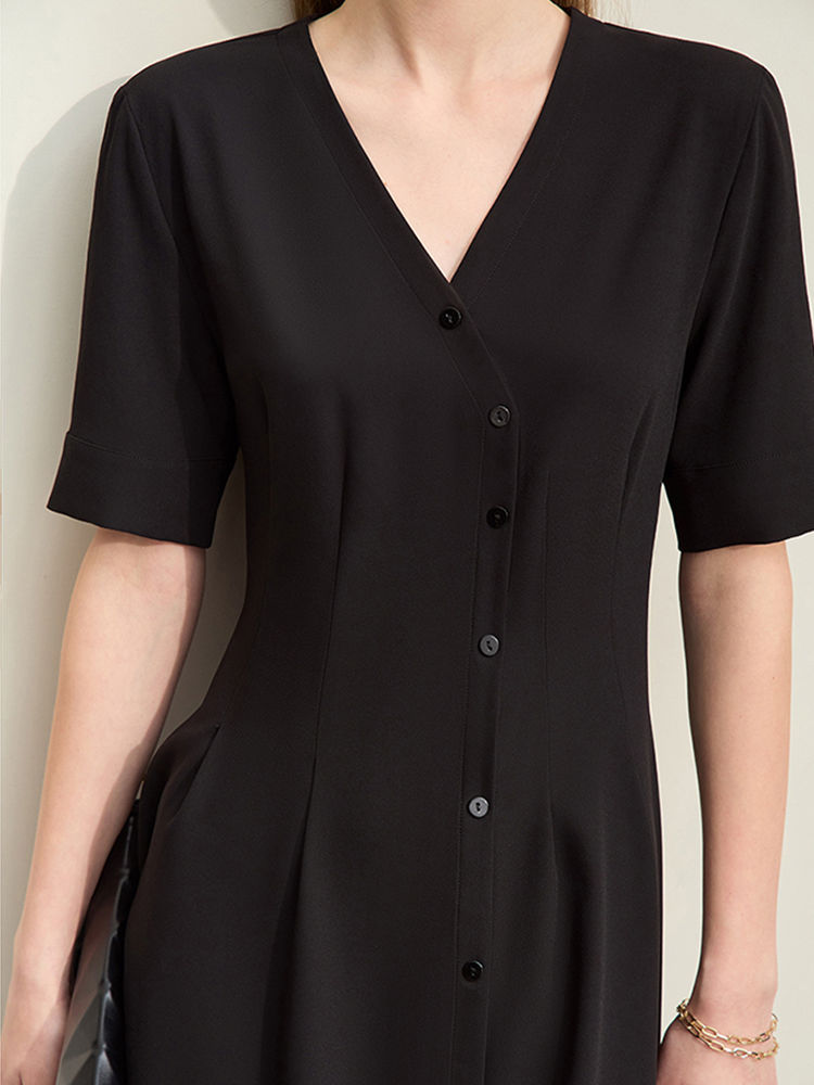 V-Neck Slim A-Line Knee-Length Polyester Dress with Zipper & Button Detail Solid