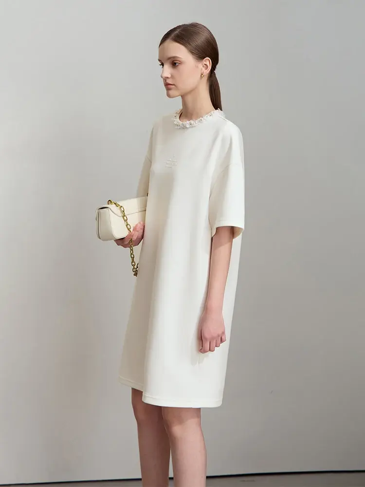O-Neck Letter Print Knit Tee with Drop Sleeves, Three-dimensional Decoration Top