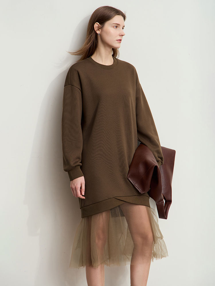 Tags:women's knee length sweatshirt dress, loose fit knit dress, autumn winter casual dress, minimalist style sweater dress, round neck long sleeve dress, spliced design midi dress, comfortable cotton blend dress, natural fiber knit dress, women's fall fashion 2024, oversized sweatshirt dress outfit, stylish casual dress for women, women's long sleeve knit dress, gauze detail sweater dress, non stretch knit dress.