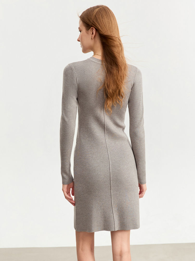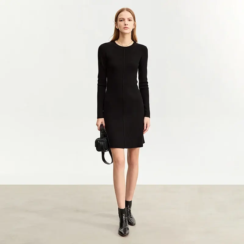 Knit Wool Blend Mini Dress, Slim Fit Straight Silhouette, Long Sleeve O-Neck Pul