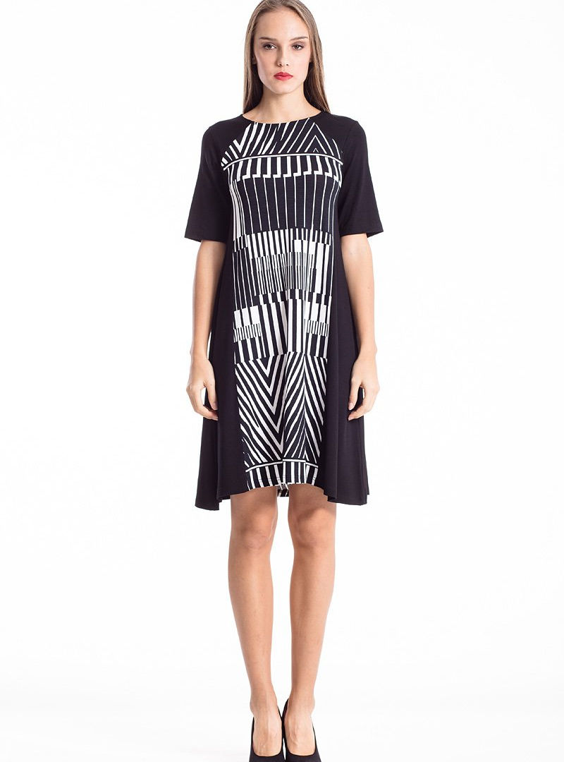 This A-line dress is designed to flatter your figure and make a statement. The classic black and white print elevates this simple piece, while the solid color adds definition.