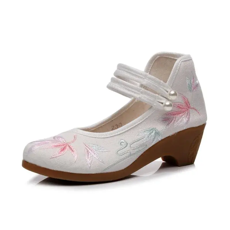 Ankle Strap Mid Heel Pumps Embroidered Mary Jane Dress Shoes Button Closure
