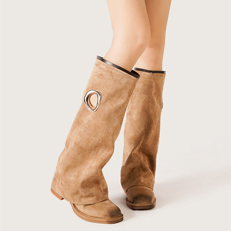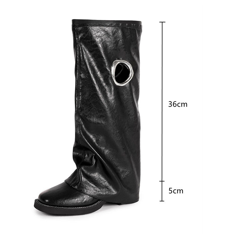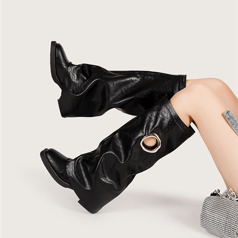 Knee-High Motorcycle Boots, Square Toe Footwear, Hollow Out Street Style
