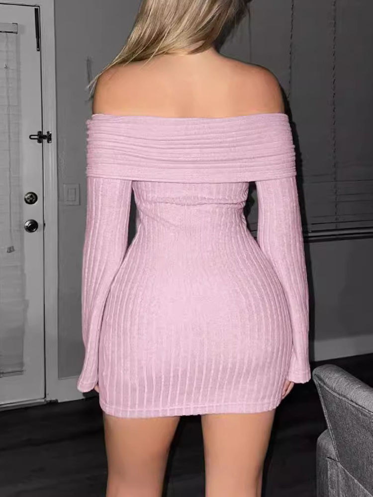 Off Shoulder Bodycon Mini Dress, Long Sleeve, Ribbed, Solid Color, Knit, Polyest