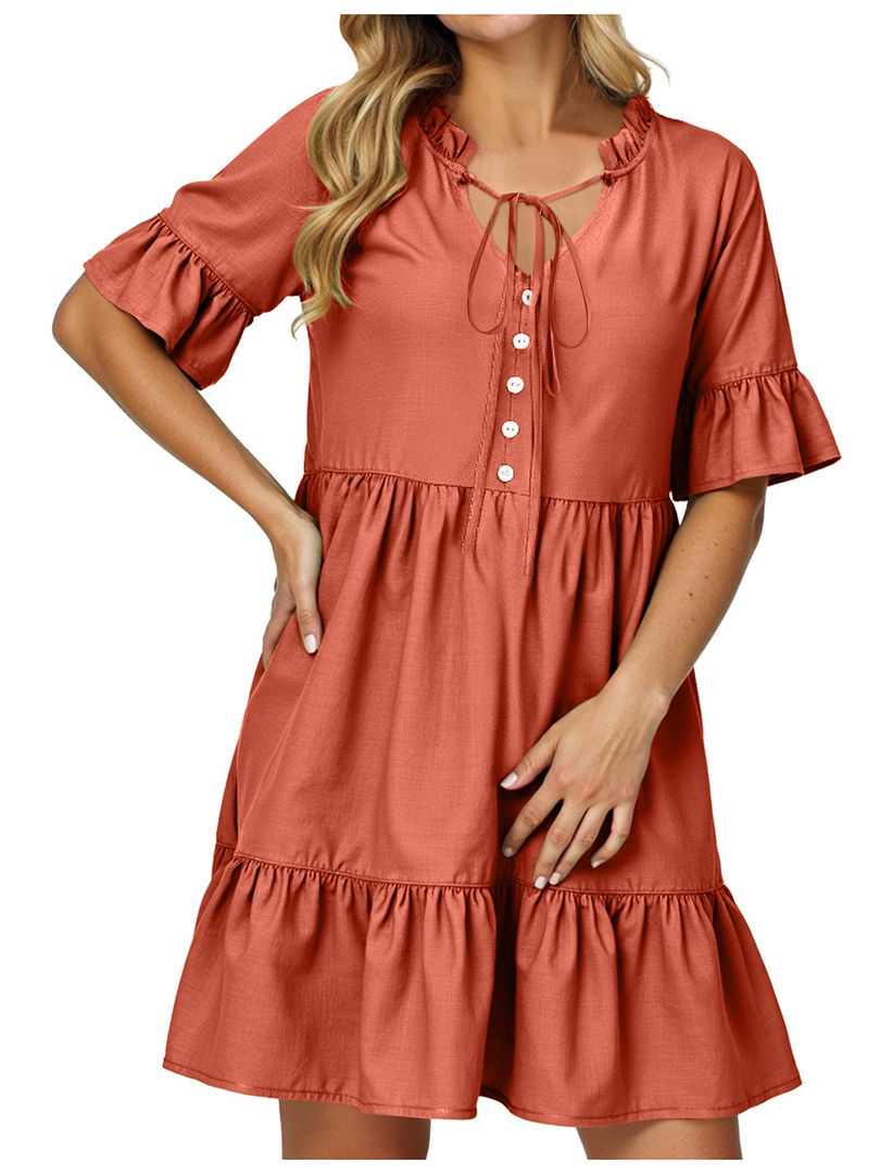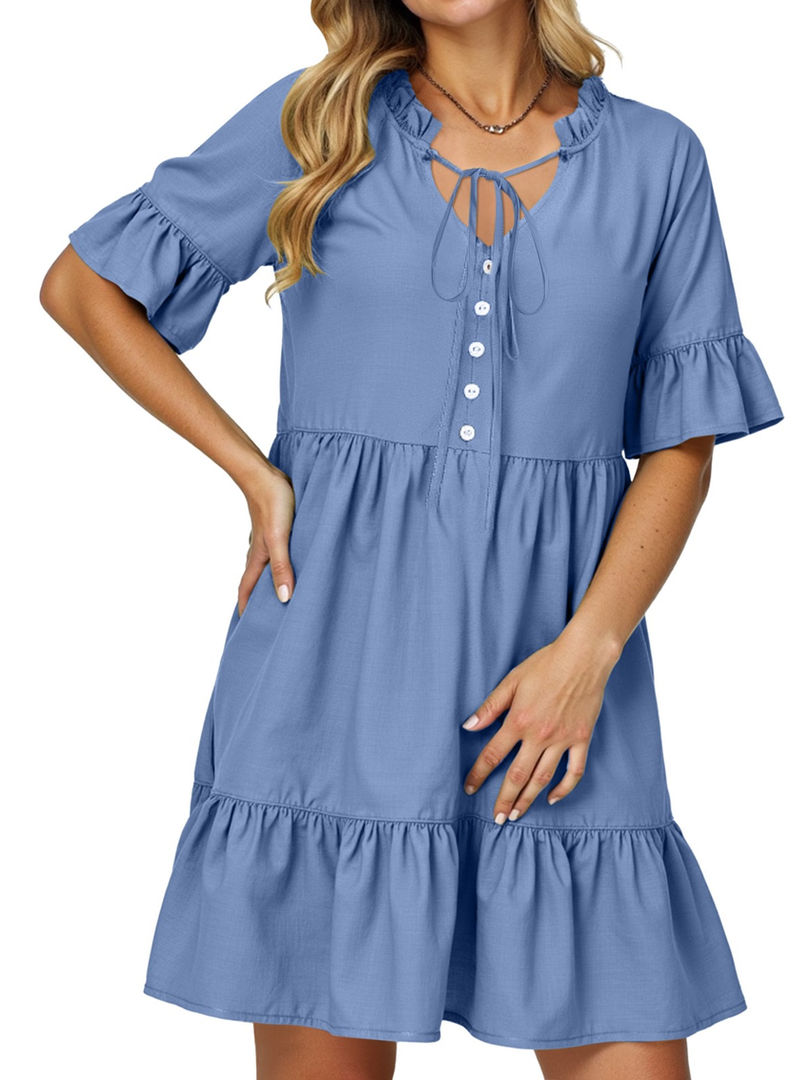 Casual Sleeveless O-Neck Button Down A-Line Knee-Length Solid Ruffle Dress