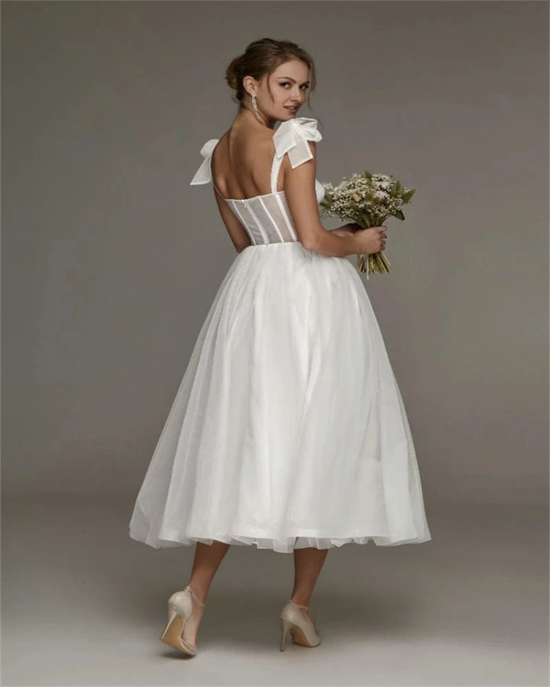 White Tulle Prom Dresses A-Line Spaghetti Straps Tea-Length Sweetheart Evening G