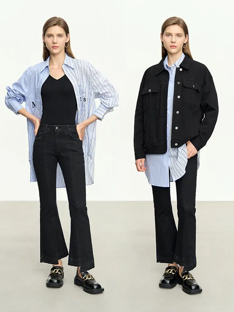 Elevate your autumn/winter wardrobe with these chic, ankle-length jeans. Crafted from a blend of cotton, polyester, spandex, and viscose, they offer a comfortable yet flattering fit. The flare silhouette adds a touch of vintage elegance while the distressed wash and subtle details create a stylishly casual look. These jeans are made from a blend of cotton, polyester, spandex, and viscose. These versatile jeans are perfect for a variety of occasions, from casual outings to office wear.