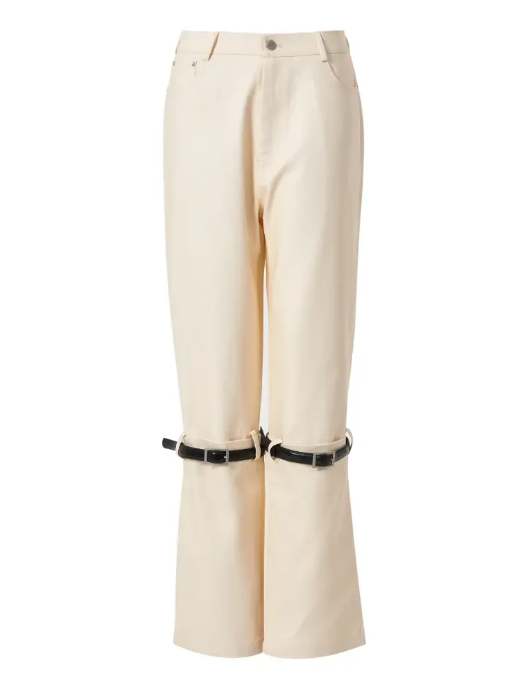 Elevate your everyday look with black and beige wide-leg pants. These comfortable, high-waisted pants offer a flattering silhouette with a touch of modern edge thanks to the hollow-out details. Functional pockets add practicality. Made from a breathable cotton-poly blend with a slight stretch, they're perfect for year-round wear.