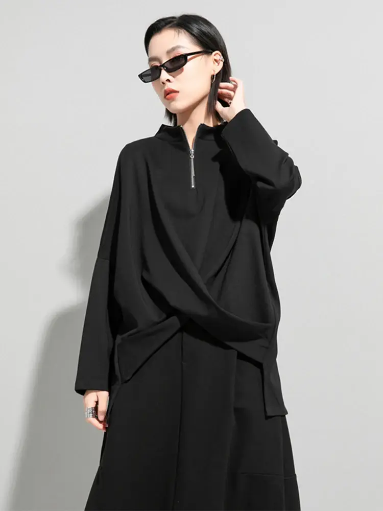 Black Turtleneck Long Sleeve Hollow Out Zipper Casual Solid Jersey Tee Cotton