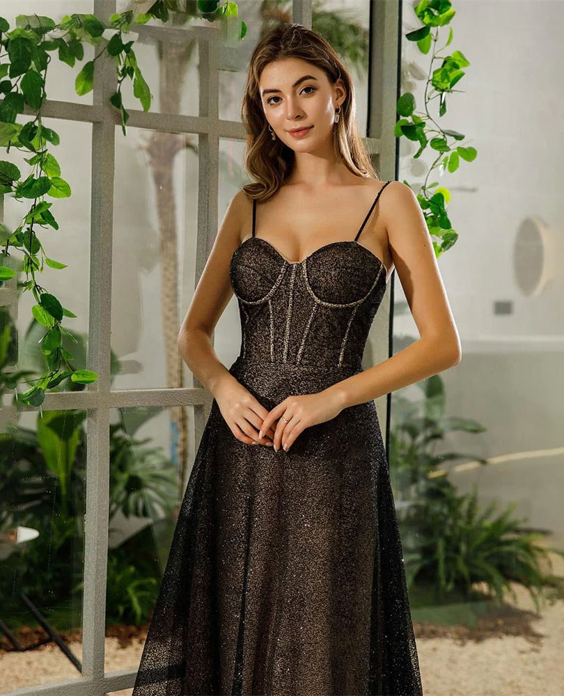 Black Sequin A-Line Prom Dresses Sweetheart Spaghetti Straps Floor-Length Evenin