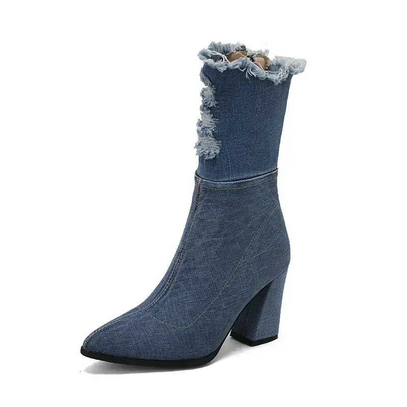 Blue Stretch Denim Socks Ankle Boots - Block High Heels