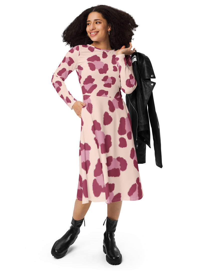 All-Over Print Midi Dress with Long Sleeves, Boat Neckline, Fitted Waist & Pocke