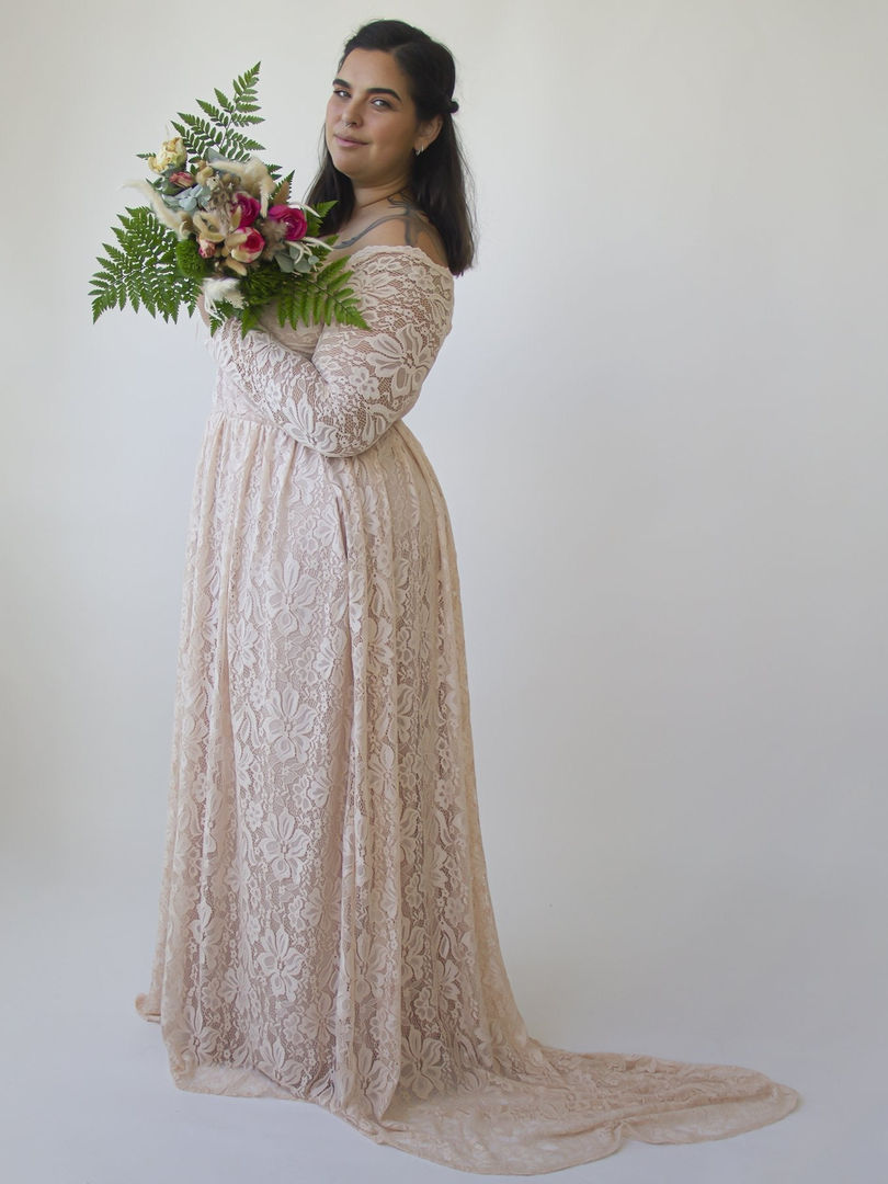 blush lace train dress, off the shoulder wedding dress, long sleeve lace gown, plus size blush dress, romantic wedding dress with pockets, comfortable wedding dress, lace sleeve formal dress, blush colored bridal gown, off the shoulder lace dress plus size, long train wedding gown, lace dress with stretch lining, blush dress for photoshoot, wedding dress with soft pockets, plus size bridal dress with sleeves