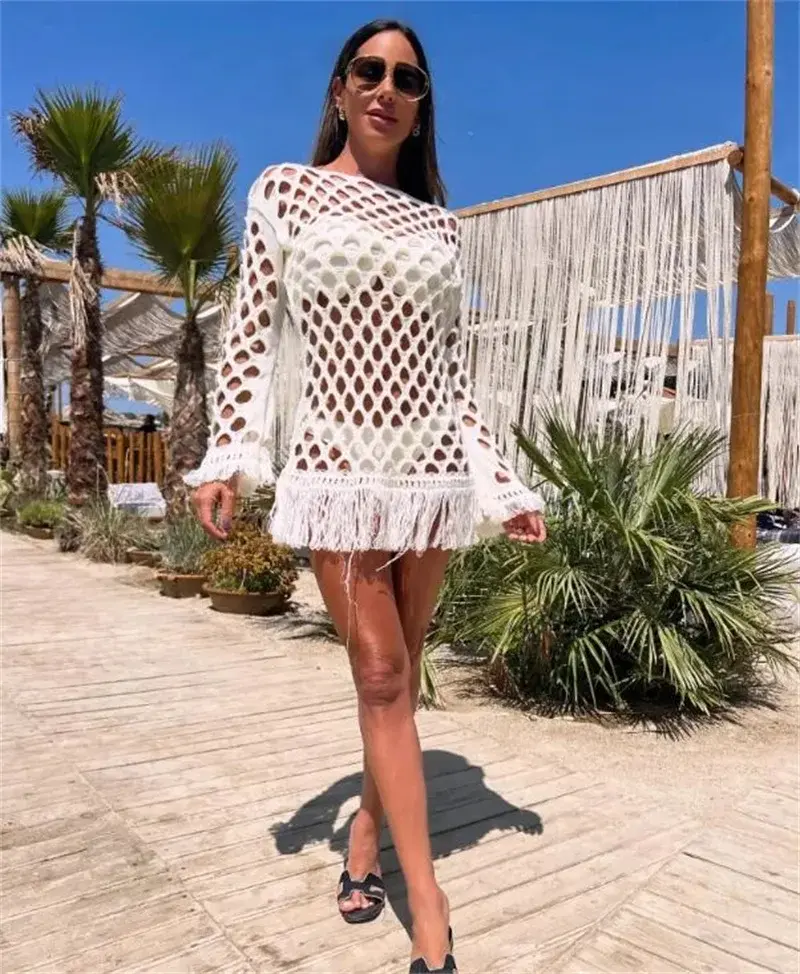 Bohemian Crochet Beach Dress Cover-Up, Long Sleeve Knit Wrap