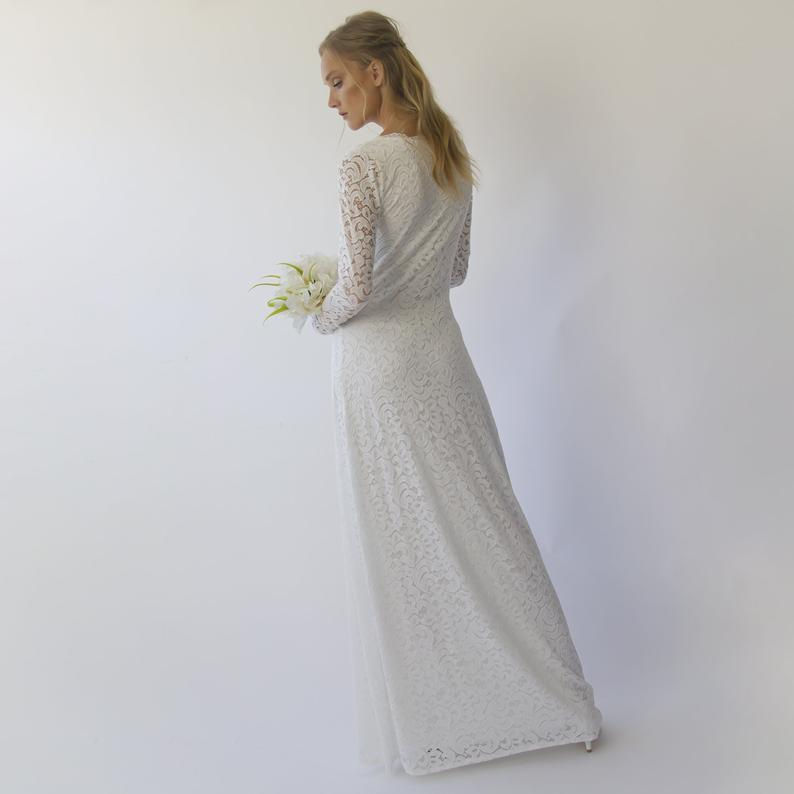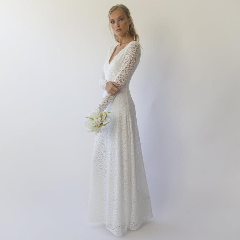 This ivory wedding dress offers a modest, vintage-inspired look for your special day. It features long sleeves, a floor-length hemline, and a flattering v-neck, all crafted from soft lace. Designed for both style and comfort, this dress ensures you feel as good as you look.