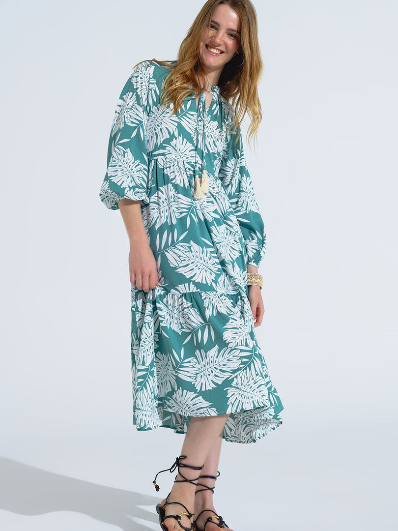Green Floral Print Cotton Boho Midi Dress with 3/4 Balloon Sleeves & Pom-Pom Det
