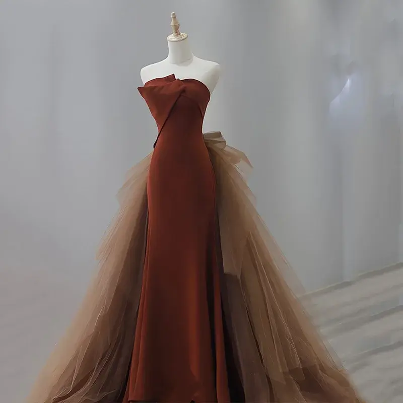 Strapless Mermaid Prom Dress Vintage Court Train Pleated Sleeveless Satin Gown K