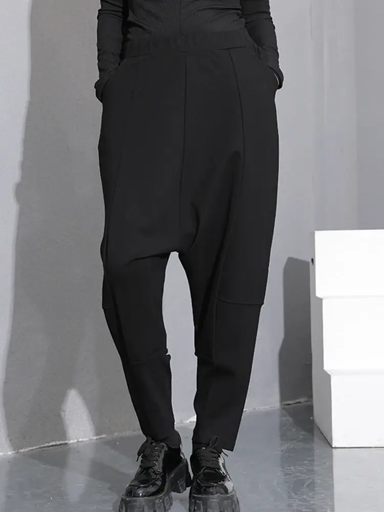 Embrace year-round comfort and effortless style with these breezy black harem pants. Made from a breathable jersey fabric with a hint of stretch, they feature a flattering high waist and a loose, comfortable fit for easy movement. Functional pockets add practicality, while a single button detail adds a touch of trendy flair. Pair them with anything for effortlessly cool looks! (138 characters)