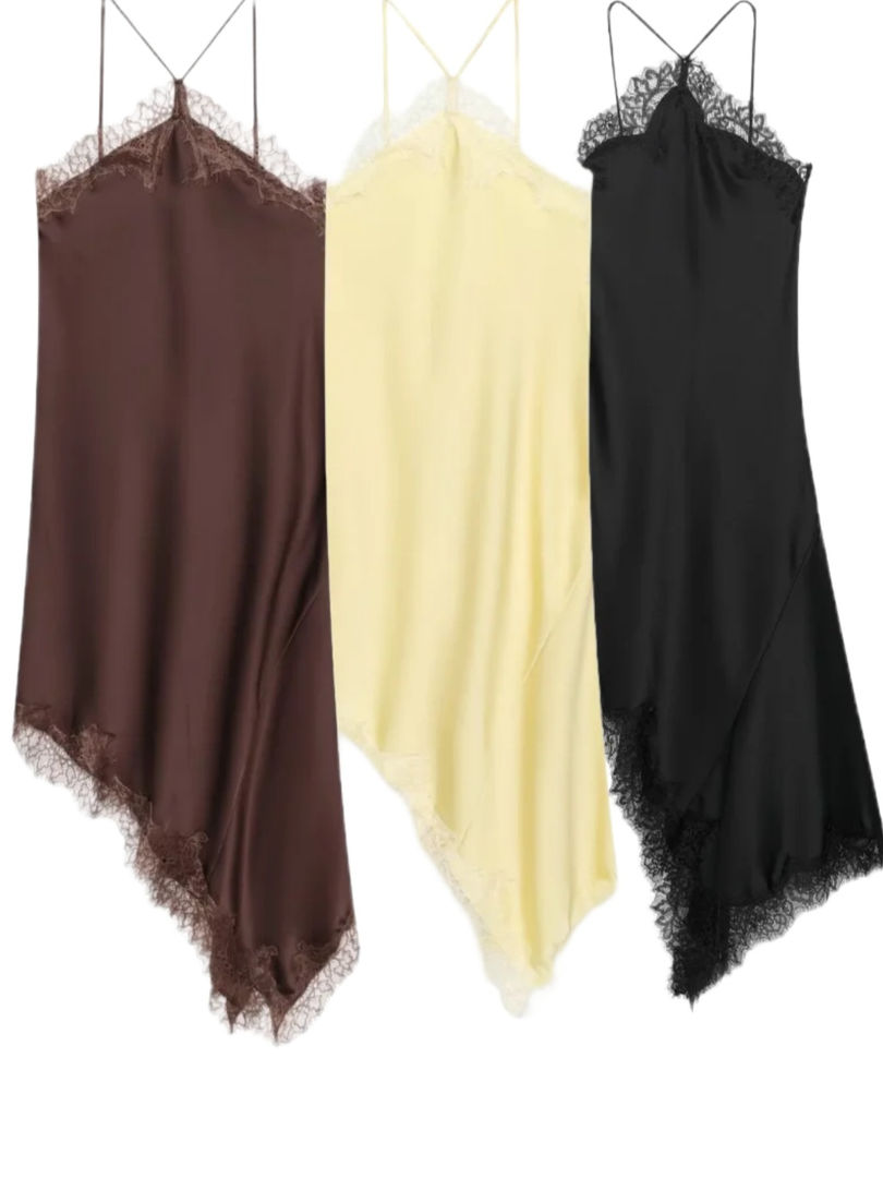 Tags: sleeveless satin slip dress with lace, knee-length loose fit satin dress, sexy club dress for women, lace trim camisole dress, pullover A-line party dress, solid color summer cocktail dress, women's date night outfit dress, comfortable sexy evening dress, spring summer loose fit dress, high neck sleeveless satin dress, satin texture dress with slight stretch, what to wear for a summer party, easy to wear sexy dress, women's sleeveless knee length dress