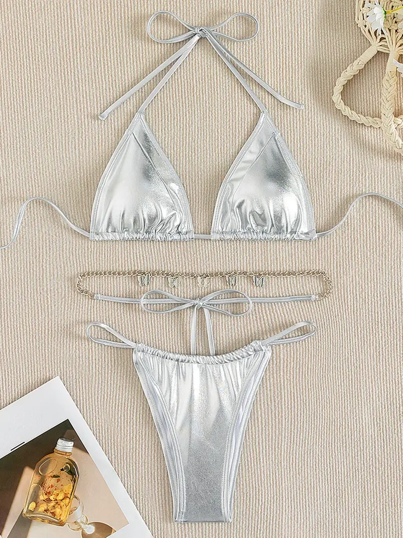 Butterfly Chain Bikini Swimsuit, Faux Leather, High Waist, Swimwear
