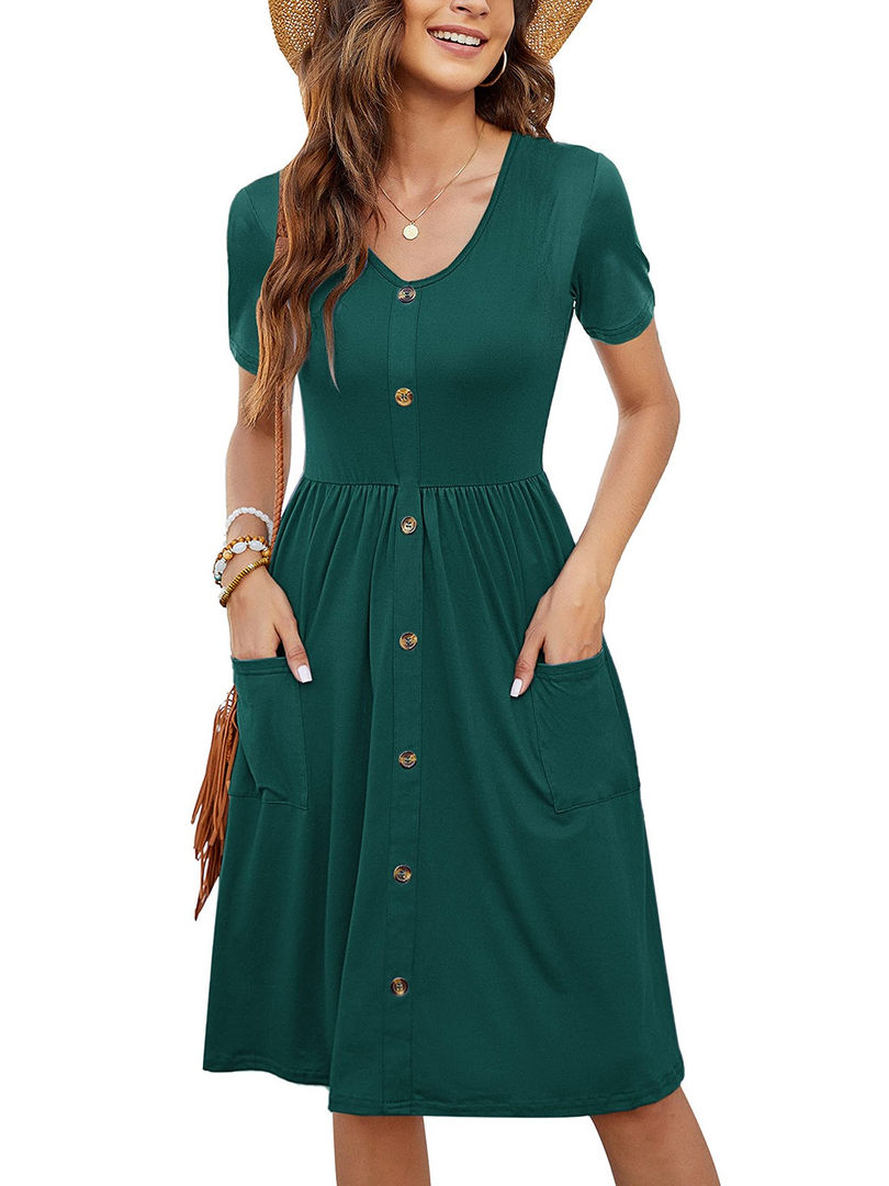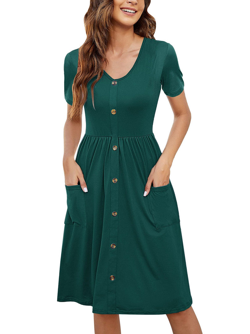 women's casual knee-length dress, short sleeve O-neck dress, A-line summer dress, comfortable knit dress, solid color everyday dress, single breasted casual dress, regular fit women's apparel, slight stretch summer dress, versatile day dress, simple style women's clothing, junior women's dress, natural waistline dress, easy wear summer outfit