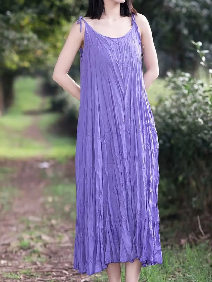 Casual O-Neck Sleeveless A-Line Polyester High Stretch Pleated Knee-Length Dress