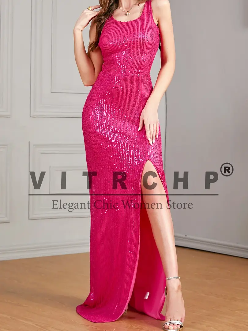 Rose Sequin Glitter Evening Dress Long Floor Length V Neck Sleeveless Prom Gown