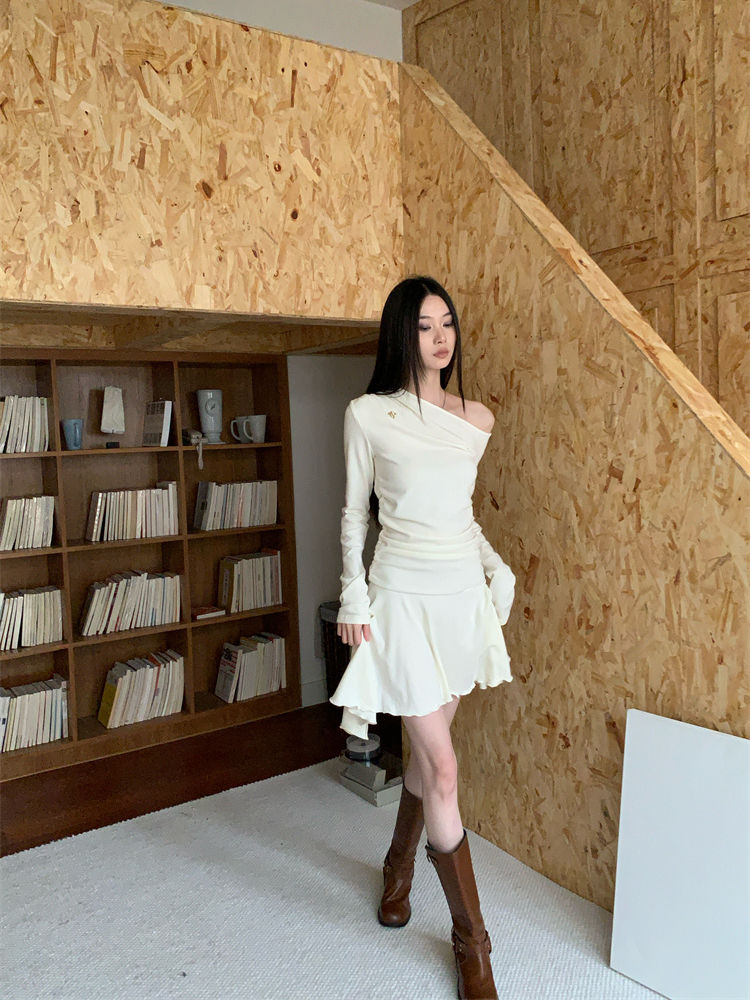 beige off the shoulder knit dress, women's slash neck pullover mini dress, autumn winter long sleeve A-line dress, casual solid color knitted dress, high stretch empire waist dress, comfortable pullover knit dress, fashion women's midi dress, woolen blend casual dress, knitted fall fashion dress, elegant slash neck pullover, soft knit A-line dress, stylish winter knit dress, trendy casual mini dress, women's pullover knitwear