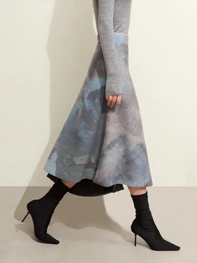 Chinese Ink Print Elastic Waist Skirt, Winter Fashion