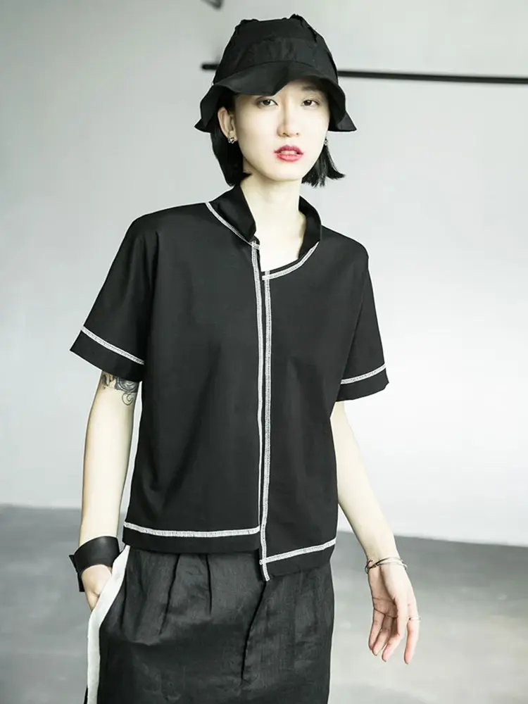 This comfy black V-neck tee by EAM is a perfect spring and summer companion. Made from a breathable cotton blend with a hint of stretch for day-long comfort, it pairs well with anything. A flattering and timeless wardrobe essential! (138 characters)