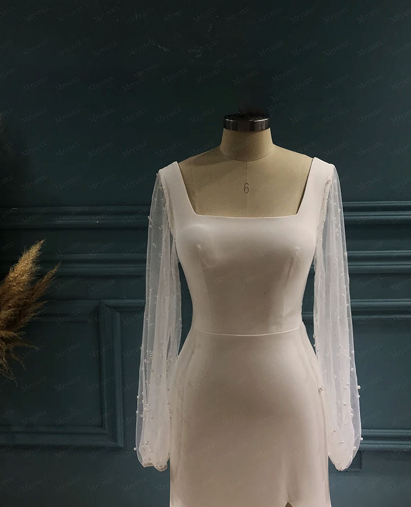 Tags:classic square neck wedding dress, long sleeve satin wedding dress, beaded wedding dress floor length, A-line wedding dress with slit, simple elegant wedding dress, backless wedding dress with sleeves, wedding dress for pregnant bride, customized wedding dress online, affordable classic wedding dress, modest wedding dress with square neckline, pearl embellished wedding dress, long sleeve wedding dress for fall, satin A-line bridal gown, wedding dress with side slit and beading.