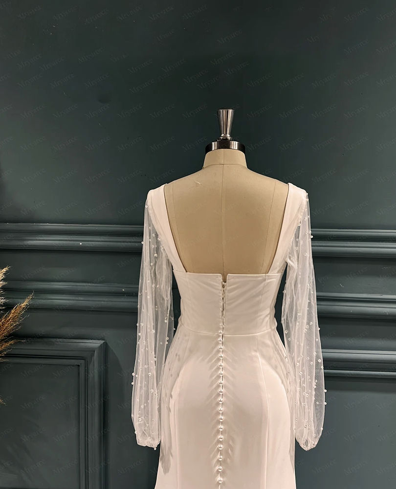 Customizable Backless Bridal Gown: Square Neck, Pearls, Long Sleeves, Side Slit,