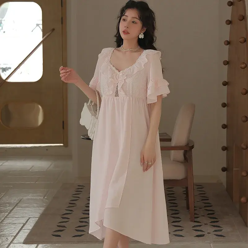 Comfortable Cotton Sleepwear Short Sleeve Lace Cutout Nightgown