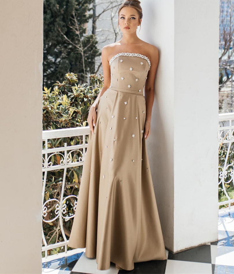- Sleek, strappy heels to complete the elongated trumpet shape.