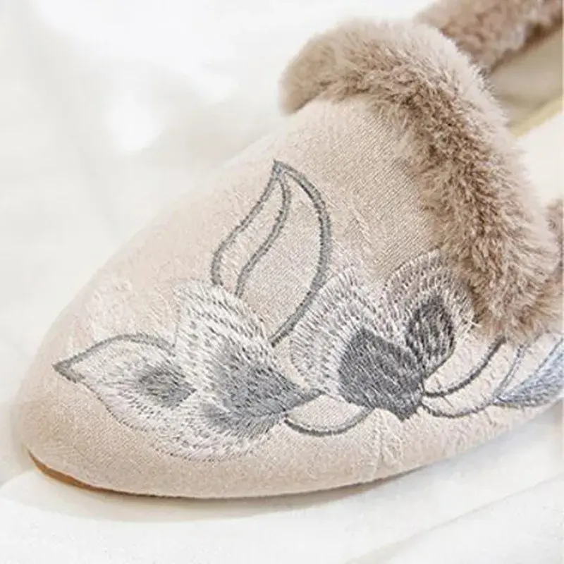 Cotton Embroidered Pumps Wedges Shoes Pointed Toe Fur Vintage Loafers