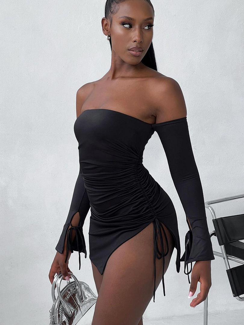 Tags:off shoulder mini dress, ruched drawstring dress, split hem dress, bodycon mini dress, knit mini dress, sexy club dress, elegant mini dress, fitted mini dress for women, all season mini dress, long sleeve mini dress, party mini dress, date night mini dress, off the shoulder cocktail dress, stretch mini dress.