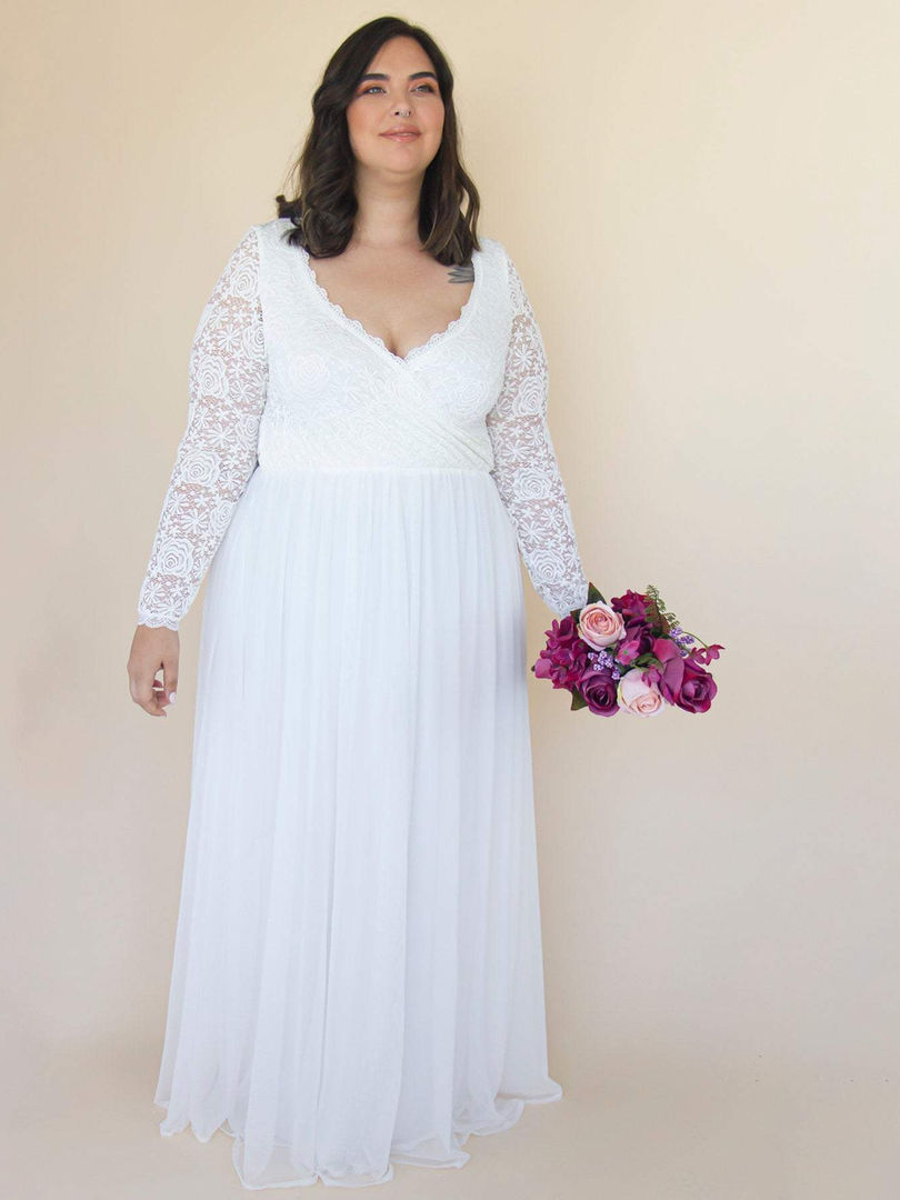 Ivory lace wedding dress, plus size wedding gown, long sleeve bridal dress, romantic wedding dress, chiffon skirt wedding dress, V-neck wedding dress, floor length wedding dress, comfortable wedding dress, elegant plus size gown, lace sleeve wedding dress, ivory bridal gown, plus size bridal wear, wedding dress with stretch, bridal dress for curvy women