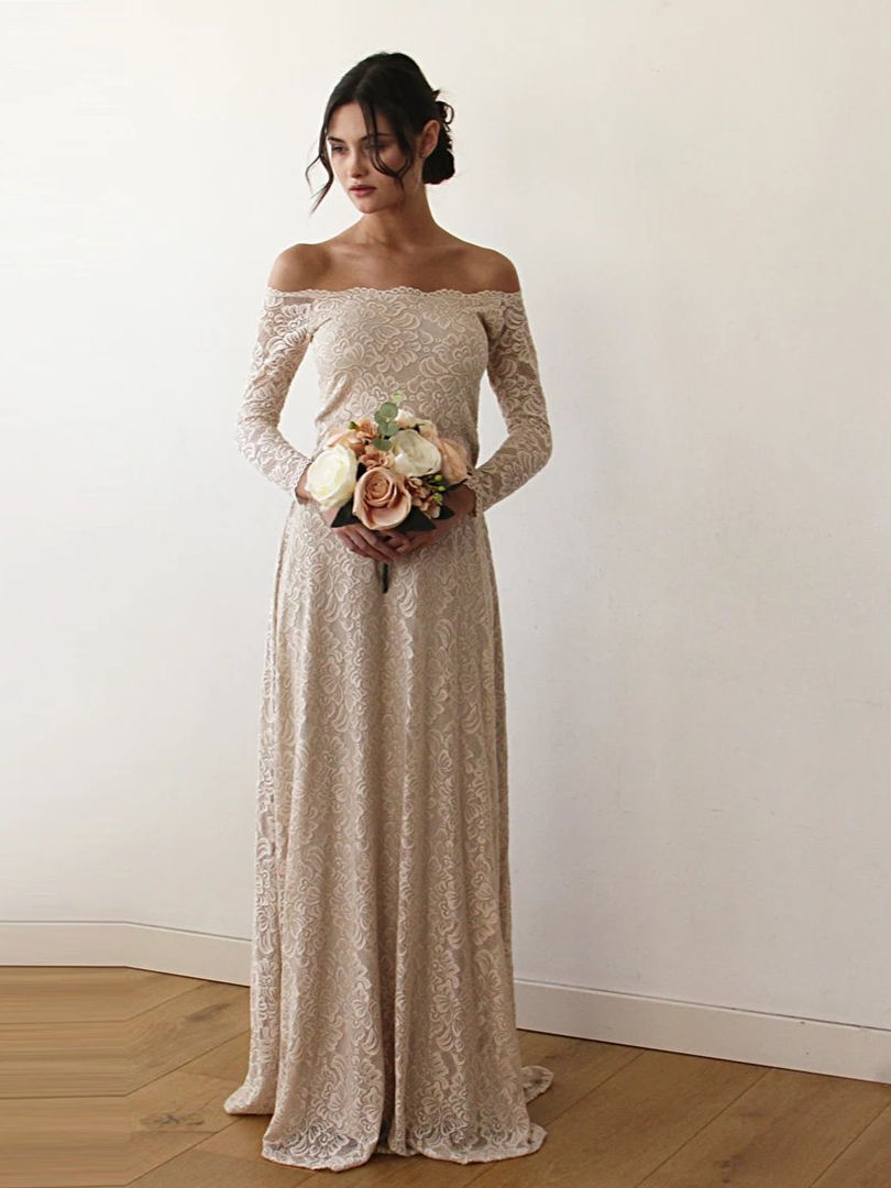 Tags: off the shoulder lace wedding dress, champagne A-line bridal gown, floral lace formal dress long, comfortable wedding dress with sleeves, bracelet sleeve bridal gown, unique handmade wedding attire, stretch fabric wedding dress, floor length champagne gown, elegant off shoulder evening dress, romantic lace bridal dress, A-line silhouette wedding gown, plus size lace wedding dress, champagne special occasion dress, bridal gown with elastic waist.