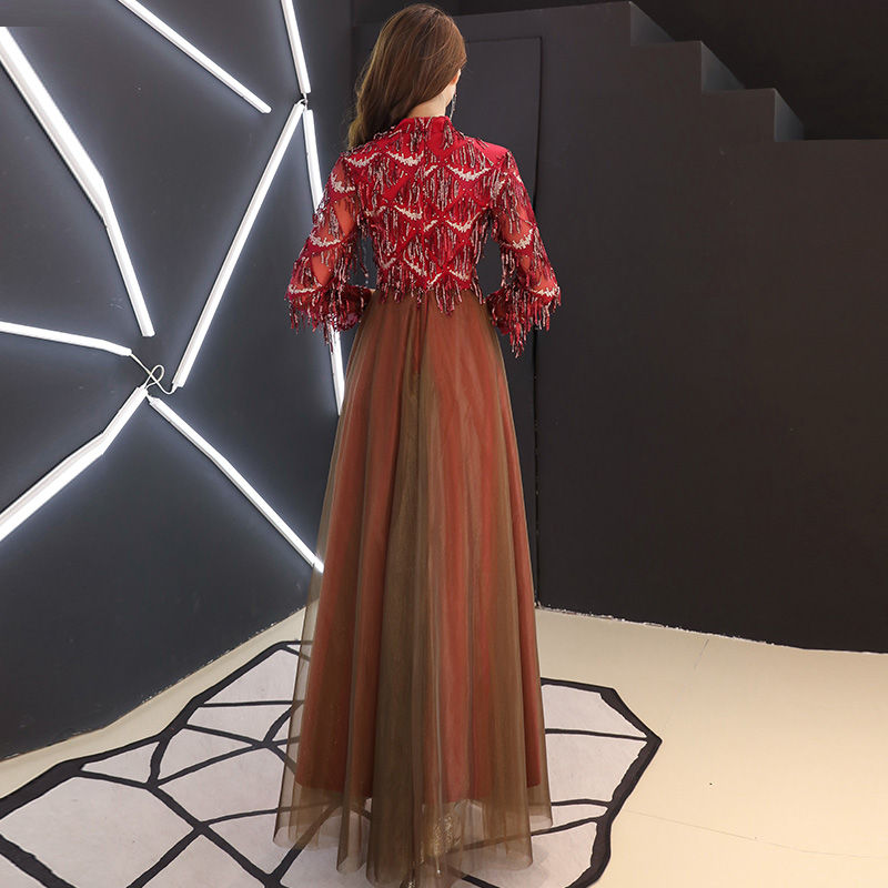 Black Evening Dress A-Line 3/4 Sleeves Floor Length Sequined High Neck Tulle Ray