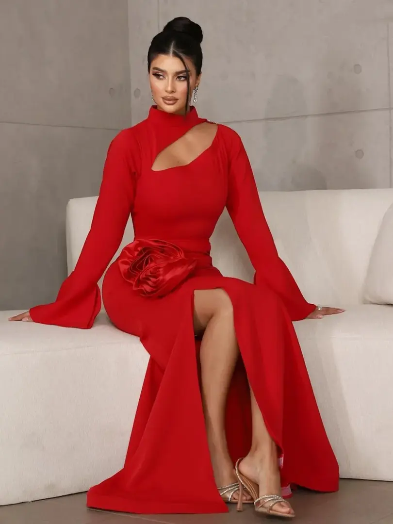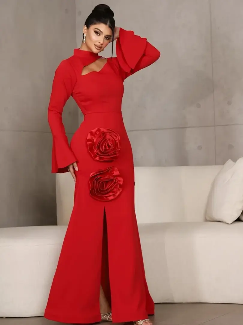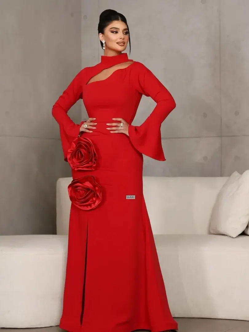 Red Evening Dress High Neck, Pleated, Flowers, Slit, Mermaid, Long Formal Polyes