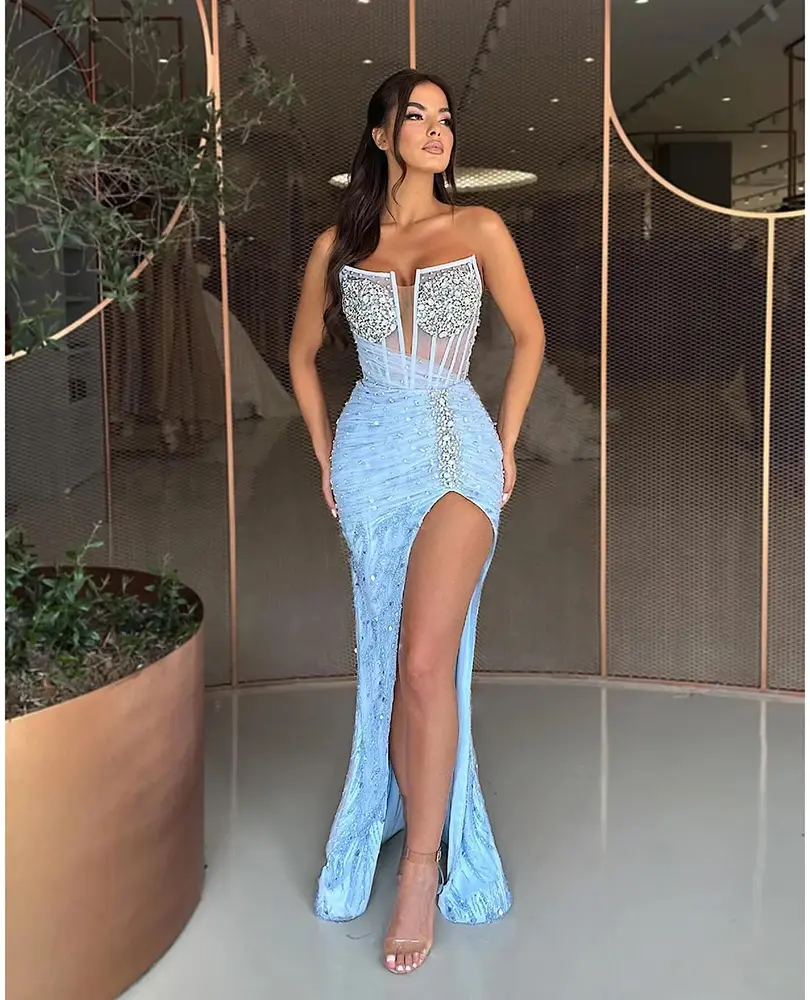 Strapless Beaded Crystal Evening Dress Lace Mermaid Party Prom Gown Floor Length